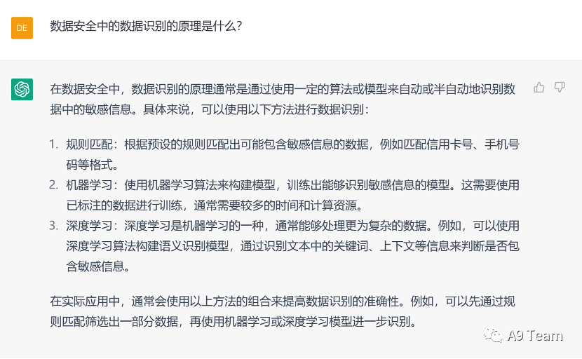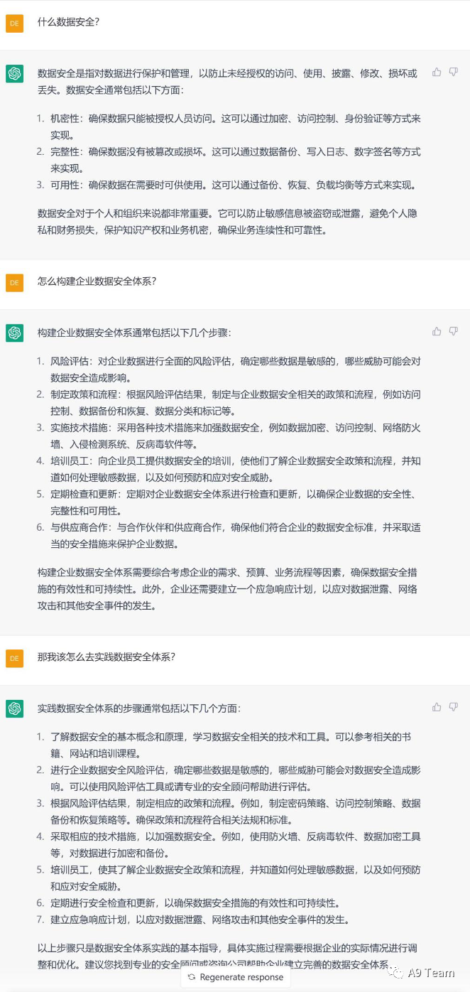 除了可以拿来实现技术手段外,也能指导如何开展数据安全工作,成为工作中的百科小能手,无所不知的“安全小顾问”。但是在使用时请注意数据的泄露,切记不要将公司内部文件及个人敏感信息放到ChatGPT上提问,毕竟不属于公司内部产品,把公司内部数据放到ChatGPT上因为数据脱离公司内部可控范围内导致存在风险隐患。