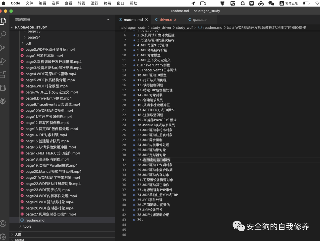 公众号:安全狗的自我修养github.com/haidragon# linux驱动开发视频教程(基于Ubuntu)* 1.视频介绍* 2.驱动开发环境工具准备* 3.最新内核源码编译安装* 4.helloworld编写与安装* 5.双虚拟机驱动源码调试* 6.操作系统与指针回顾* 7.vscode编写驱动搭建* 8.linux驱动的分类* 9.字符驱动模型* 10.字符驱动IO例程* 11.编写用户调用内核模块* 12.内核创建线程* 13.内核进程上下文* 14.同步机制-互斥锁* 15.同步机制-读写锁* 16.同步机制-自旋锁* 17.同步机制-信号量* 18.同步机制-条件变量* 19.同步机制-屏障* 20.ioctl控制例程* 21.内核中的数据结构* 22.内核中错误处理* 23.驱动模块之间通信* 24.阻塞IO* 25.poll与select* 26.异步通知* 27.时间操作* 28.定时器* 29.tasklets机制* 30.工作队列* 31.内核中内存操作* 32.IO端口介绍* 33.64位编写汇编与调用约定* 34.汇编实现IO端口操作* 35.pci总线介绍与获取* 36.usb设备基础* 37.linux设备模型* 38.热插拔事件* 39.内核内存映射* 40.块驱动注册* 41.网络驱动开发* 42.TTY驱动开发