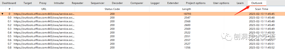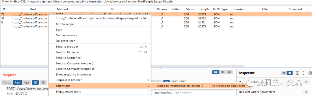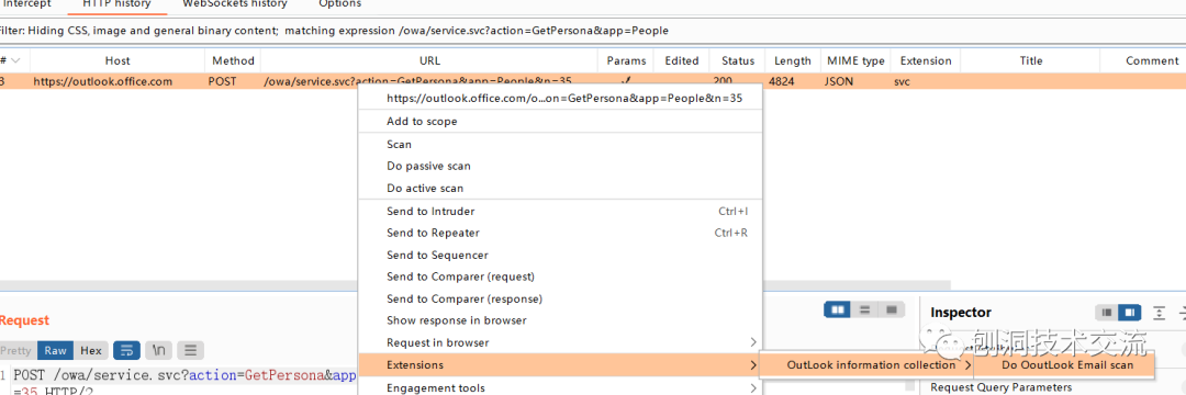 选中该请求,右键菜单 Extensions -> OutLook information collection -> Do OoutLook Email scan插件会自动爬取所有数据包并生成目录树,可以查看每一个请求响应包