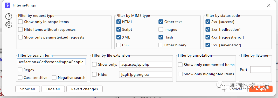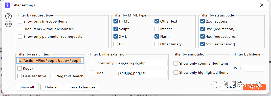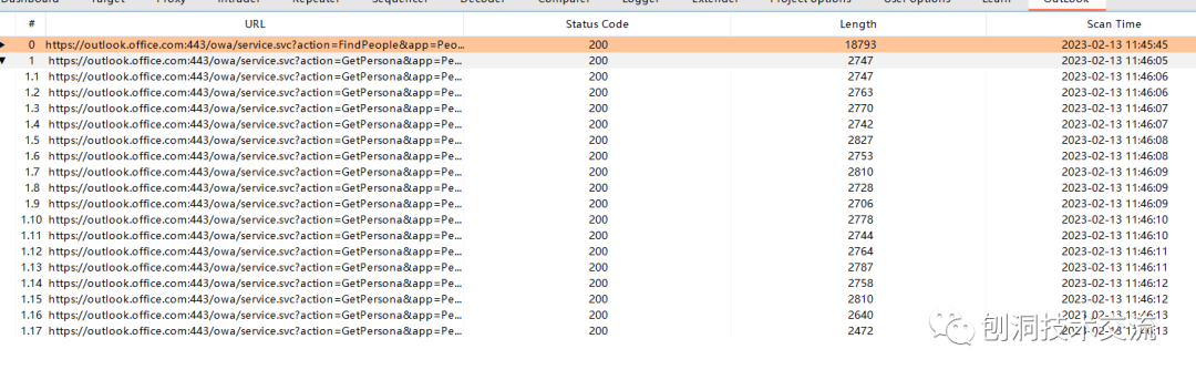 Burp 加载插件后,进入 Outlook 联系人面板,点击 All Users在 Burp 中 Proxy -> HTTP history 筛选 api 接口/owa/service.svc?action=FindPeople&app=People