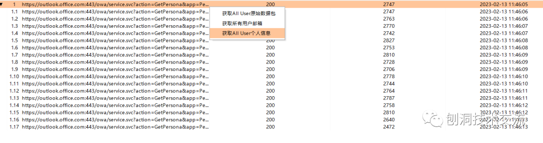 右击该请求会弹出右键菜单,选择获取所有用户邮箱,即可获得所有的邮箱必须在加载 All Users 的所有数据包才能正常使用,联系人信息基于 All Users数据包信息在 Burp 中 Proxy -> HTTP history 筛选 api 接口/owa/service.svc?action=GetPersona&app=People
