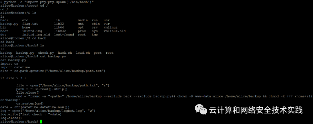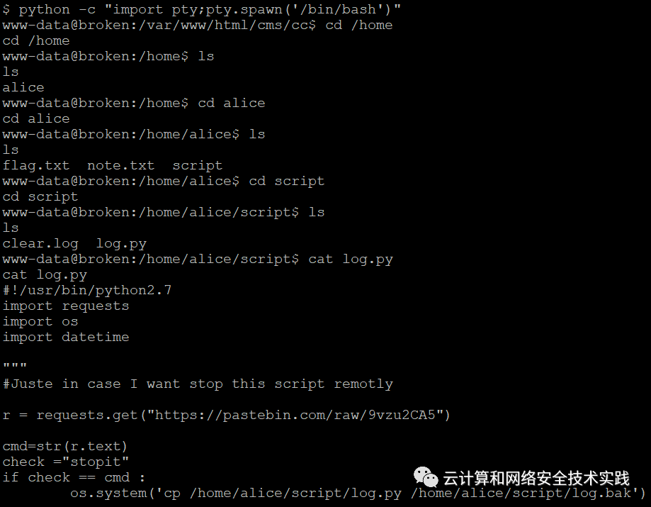 发现了alice用户,且有个脚本能定时被以alice用户执行,
