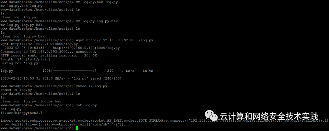 在kali攻击机上构造这个脚本,vim log.py,同样里面放上反弹shell命令,