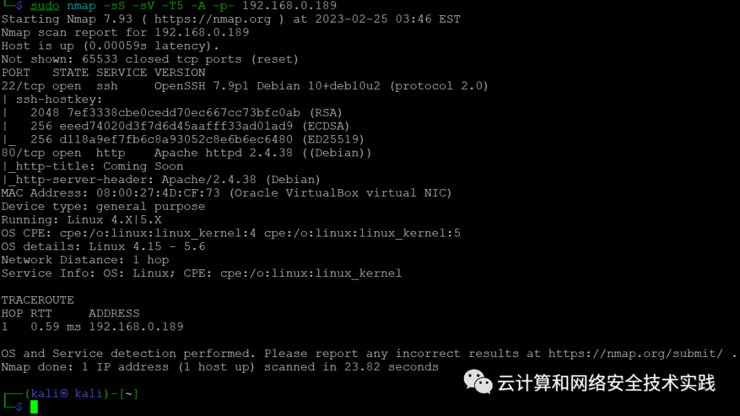 再继续做端口扫描,sudo nmap -sS -sV -T5 -A -p- 192.168.0.189,
