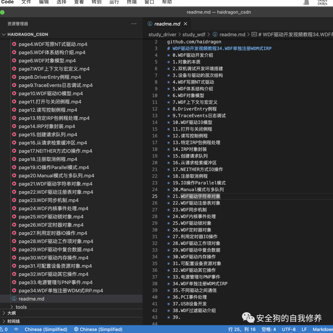 公众号:安全狗的自我修养github.com/haidragon# linux驱动开发视频教程(基于Ubuntu)* 1.视频介绍* 2.驱动开发环境工具准备* 3.最新内核源码编译安装* 4.helloworld编写与安装* 5.双虚拟机驱动源码调试* 6.操作系统与指针回顾* 7.vscode编写驱动搭建* 8.linux驱动的分类* 9.字符驱动模型* 10.字符驱动IO例程* 11.编写用户调用内核模块* 12.内核创建线程* 13.内核进程上下文* 14.同步机制-互斥锁* 15.同步机制-读写锁* 16.同步机制-自旋锁* 17.同步机制-信号量* 18.同步机制-条件变量* 19.同步机制-屏障* 20.ioctl控制例程* 21.内核中的数据结构* 22.内核中错误处理* 23.驱动模块之间通信* 24.阻塞IO* 25.poll与select* 26.异步通知* 27.时间操作* 28.定时器* 29.tasklets机制* 30.工作队列* 31.内核中内存操作* 32.IO端口介绍* 33.64位编写汇编与调用约定* 34.汇编实现IO端口操作* 35.pci总线介绍与获取* 36.usb设备基础* 37.linux设备模型* 38.热插拔事件* 39.内核内存映射* 40.块驱动注册* 41.网络驱动开发* 42.TTY驱动开发