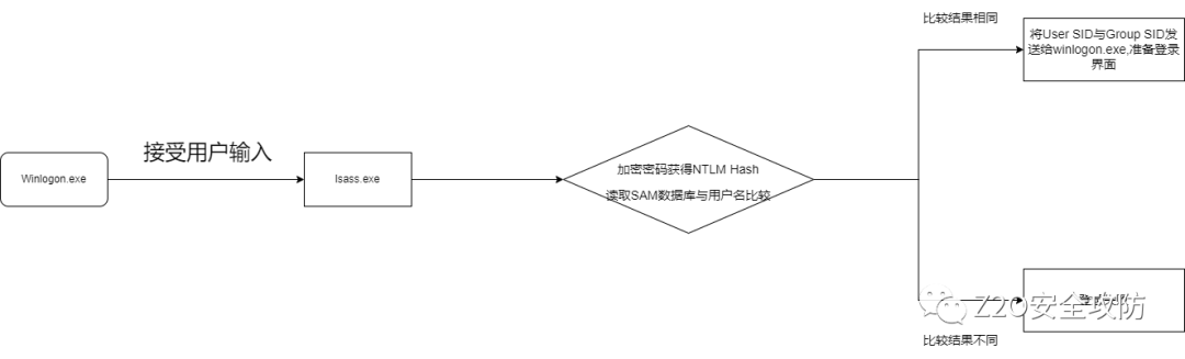 当我们登录系统的时候,系统会将用户输入的密码计算成NTLM Hash,然后与sam数据库中该用户的哈希比对,匹配则登陆成功,不匹配则登陆失败