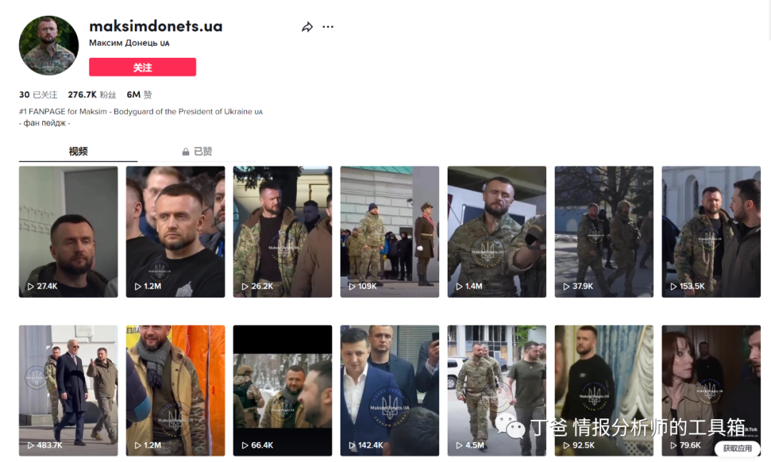 小编搜索了一下这个马克西姆·顿涅茨(Maxim Donets),发现这个人还有TikTok账号(账号地址:https://www.tiktok.com/@maksimdonets.ua),上面还发布了不少他跟随泽连斯基的短视频。
