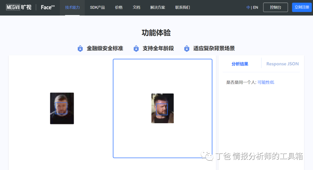 用旷视人脸比对工具比对也显示两张照片是同一人可能性较低。
