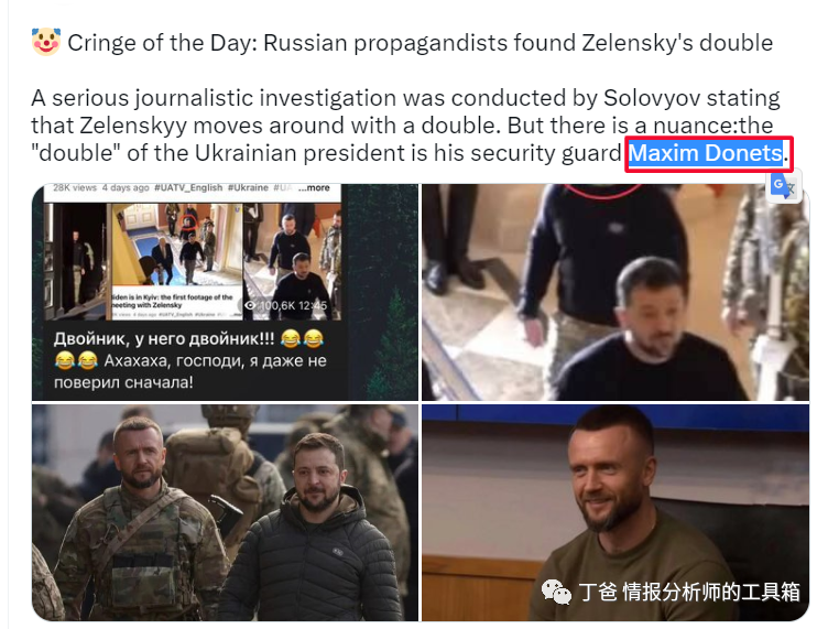 而随后乌克兰媒体声称那位被称为泽连斯基替身的其实是泽连斯基的贴身保镖马克西姆·顿涅茨(Maxim Donets)。