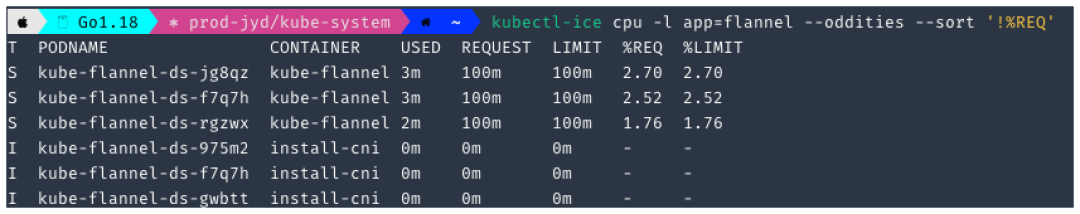 kubectl-ice cpu # 返回CPU请求的大小,限制和每个容器的使用