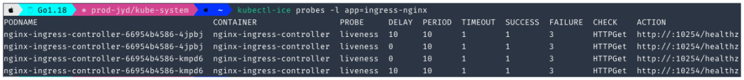 kubectl-ice probes # 显示每个容器配置的启动、就绪和活动探针的详细信息