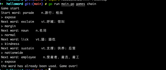 这是一个单词接龙游戏,游戏开始时系统会随机选择一个单词。玩家需要以该单词的最后一个字母为开头输入一个新单词,接着程序又以玩家输入单词的最后一个字母为开头输出新单词。游戏会持续进行,直到有一方出现错误。