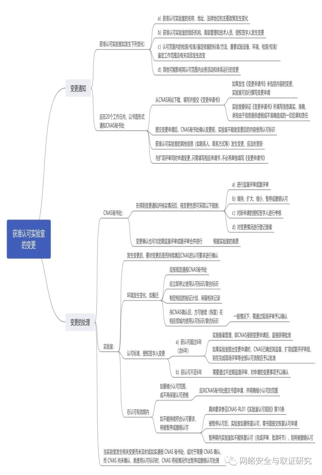 实验室从CNAS网站下载、填写并提交《变更申请书》。如果发生《变更申请书》未包括内容的变更,实验室可自行撰写变更申请。实验室要保证《变更申请书》所填写信息真实、准确,并承担由于信息提供虚假或不准确而造成的一切后果和责任。公众号[实验室ISO17025]提醒,提交变更申请后,在 CNAS 秘书处确认变更前,实验室不能就变更后的内容使用认可标识。获准认可实验室的其他信息(如联系人、联系方式等)发生变更,应及时更新。与扩项评审同时申请变更 ,只需填写相应申请书 ,不必再单独填写《变更申请书》。CNAS 秘书处在得到变更通知并核实情况后,CNAS 视变更性质可以采取以下措施:根据实验室的意愿,CNAS安排的变更确认也可与定期监督评审或复评审合并进行。实验室在发生变更后,要确认是否持续满足 CNAS 的认可要求。当实验室的环境发生变化,如搬迁,实验室除按上述规定通报 CNAS 秘书处外,还应立即停止使用认可标识/联合标识,并制定相应的验证计划,保留相关记录,待 CNAS 确认后,方可继续(恢复)在相应领域内使用认可标识/联合标识。公众号[实验室ISO17025]提醒,一般情况下,环境变化需通过现场评审予以确认。对实验室提认可标准、授权签字人的变更,CNAS秘书处针对实验室的情况采取不同的方式进行确认:- a)获认可超过 6 年(含 6 年)的实验室,实施备案管理,即接到变更申请后,直接获得批准;如果实验室提出变更申请时, CNAS 秘书处已确定其监督、扩项或复评评审组的,则在完成现场评审等全部认可流程后予以批准。