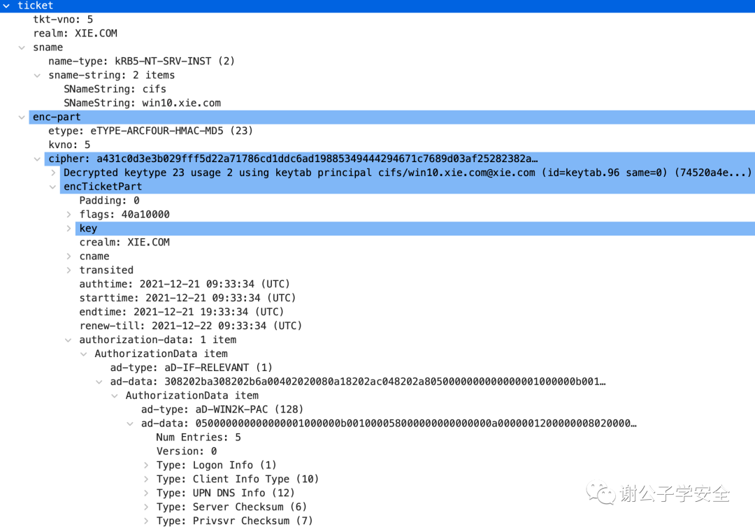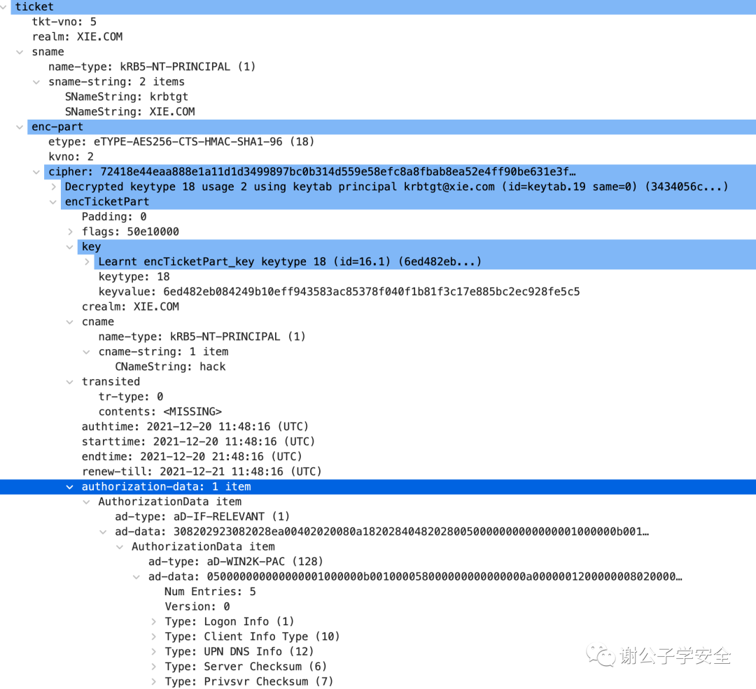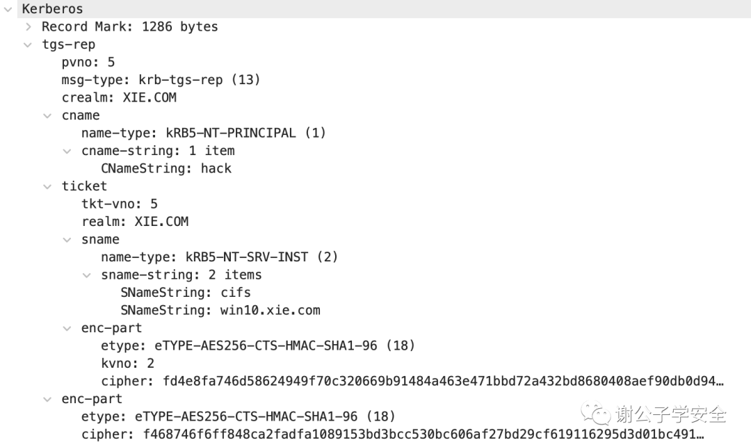 pvno:kerberos版本号,这里为5msg-type:消息类型,TGS_REP对应的是 krb-tgs-rep(13)crealm: 域名,这里是XIE.COMcname:请求的用户名name-type: 名称类型,这里为 KRB5-NT-PRINCIPAL(1)cname-string: 1 itemCNameString: hackticket:即ST服务票据tkt-vno: 服务票据版本号,这里为5realm: 域名,这里是XIE.COMsname:name-type: KRB5-NT-SRV-HST(3)sname-string: 2 itemsSNameString: cifsSNameString: win10.xie.comenc-part: 这部分是用服务的密钥加密的etype: 加密类型,eTYPE-AES256-CTS-HMAC-SHA1-96(18)kvno: 版本号,这里为3cipher:加密后的值enc-part:这部分是用原始的Logon Session Key加密的。里面最重要的字段是Service session key,作为下阶段的认证密钥。etype: 加密类型eTYPE-AES256-CTS-HMAC-SHA1-96(18)cipher: 加密后的值