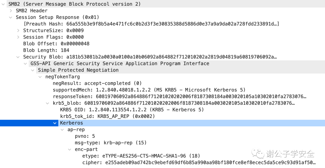 注:由于impacket默认是不需要验证服务端身份的,因此如图所示是其他请求方式的AP-REP回复包截图。