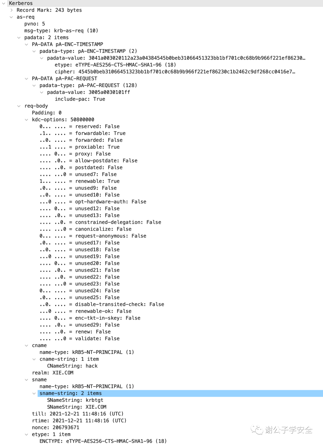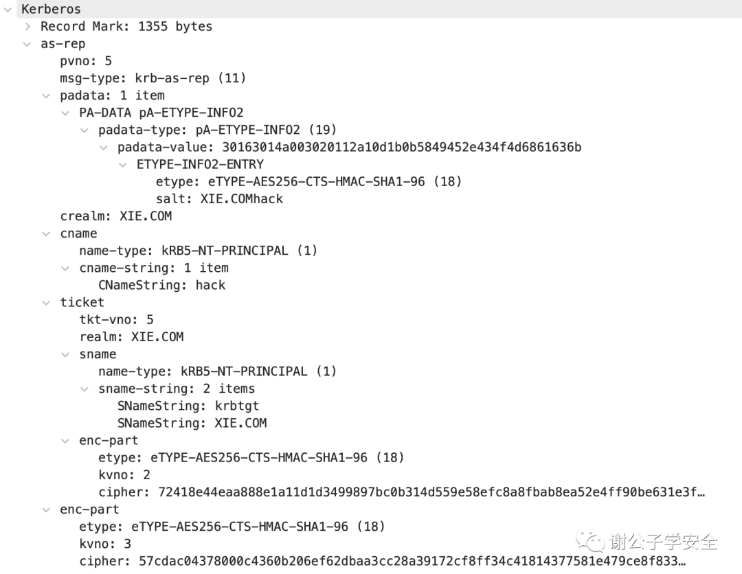 pvno:kerberos版本号,这里为5msg-type:消息类型,AS_REP对应的是 krb-as-rep(11)padata:主要是一些认证信息。一个列表,包含若干个认证消息用于认证PA-DATA PA-ENCTYPE-INFO2padata-type: padata的类型,这里是 pA-ETYPE-INFO2(19)padata-value: 加密后的值ETYPE-INFO2-ENTRYetype: eTYPE-AES256-CTS-HMAC-SHA1-96(18)salt: 盐值,这里是 XIE.COMhackcrealm: 域名,这里是XIE.COMcname:请求的用户名name-type: 用户名类型,这里是 kRB5-NT-PRINCIPAL(1)cname-string: 1itemCNameString: hackticket:TGT认购权证tkt-vno: TGT版本号,这里为5realm: 域名,这里是 XIE.COMsname: 服务用户名,这里是krbtgt 密码分发中心服务账号name-type: KRB5-NT-SRV-INST(2)sname-string: 2itemsSNameString: krbtgtSNameString: XIE.COMenc-part: TGT票据中的加密部分,这部门是用krbtgt的密码Hash加密的。因此如果我们拥有krbtgt的hash就可以自己制作一个ticket,这就造成了黄金票据攻击etype: 加密类型,这里是 eTYPE-AES256-CTS-HMAC-SHA1-96(18)kvno: 版本号,这里为2cipher:加密后的值enc-part:Login session key,这部分是用请求的用户密码Hash加密的,作为下阶段的认证密钥。etype: eTYPE-AES256-CTS-HMAC-SHA1-96(18)kvno: 版本号,这里为3cipher:加密后的值