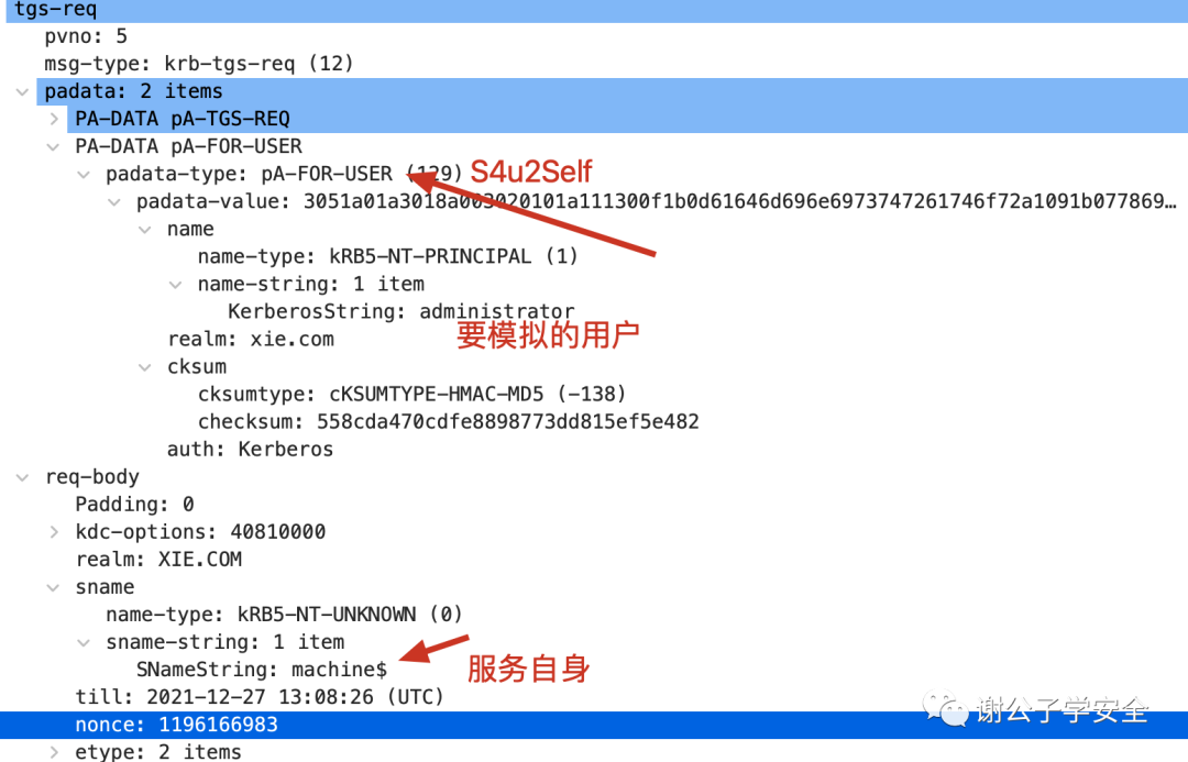 和正常的TGS-REQ请求包相比,S4u2Self协议的TGS-REQ请求包会多一个PA-DATA pA-TGS-USER,name为要模拟的用户。