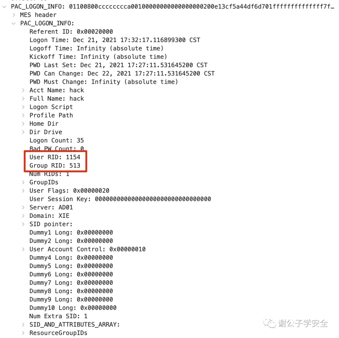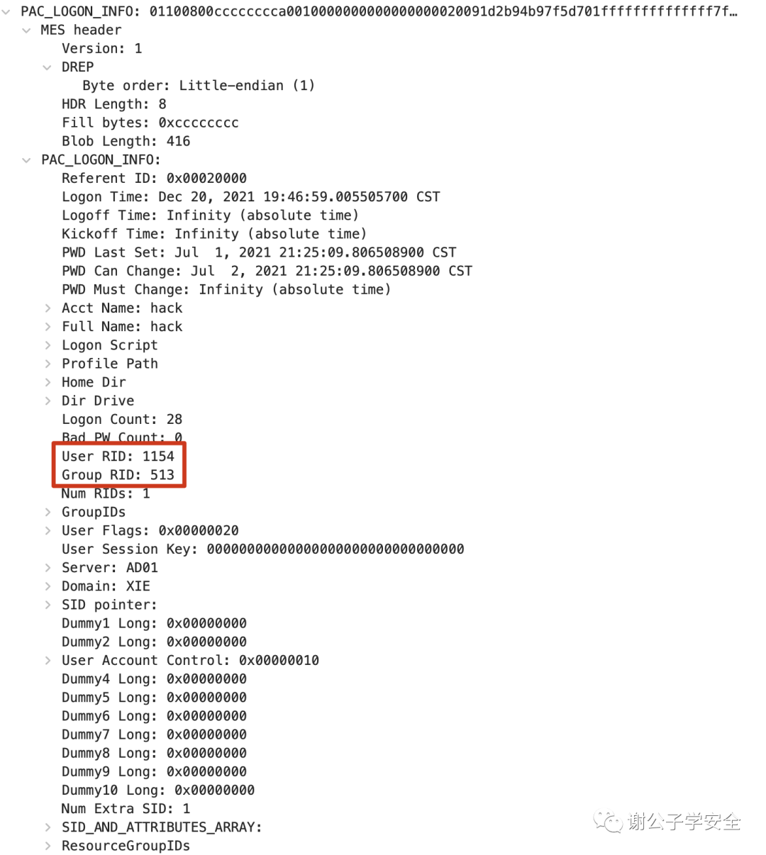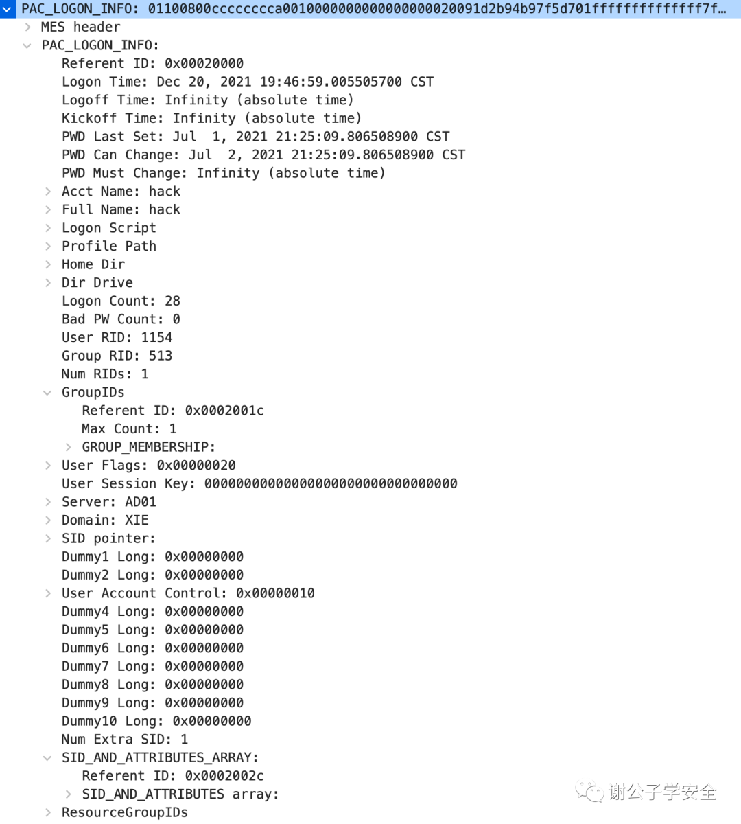 我们来看看ST服务票据中authorization-data字段下代表用户身份权限的PAC是啥样的。我们对PAC进行解密,只查看PAC的凭证信息部分PAC_LOGON_INFO。