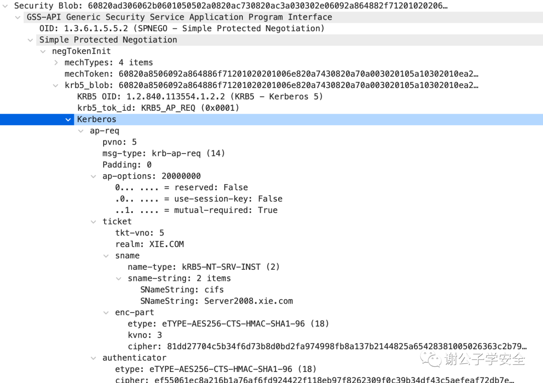 pvno:kerberos版本号,这里为5msg-type:消息类型, AP_REQ 对应的是 krb-ap-req(14)Padding:填充,这里为0ap-options: 一些协商选项reserveduse-session-keymutual-required 该选项代表客户端是否希望验证提供服务的服务端ticket: ST服务票据tkt-vno: 版本号,这里为5realm: XIE.COMsname:服务名name-type: KRB5-NT-SRV-INST(2)sname-string: 2 item2SNameString: cifsSNameString: win10.xie.comenc-part: ST服务票据中加密部分etype:加密类型,eTYPE-AES256-CTS-HMAC-SHA1-96(18)kvno: 版本号,这里是2cipher:加密后的值authenticator: Serivce Session Key加密的时间戳etype:加密类型cipher:加密后的值