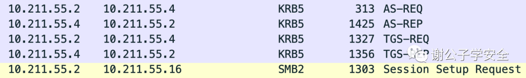 在这个过程中,我们使用WireShark抓包,来进一步的分析Kerberos协议。如图所示,是该过程的抓包图: