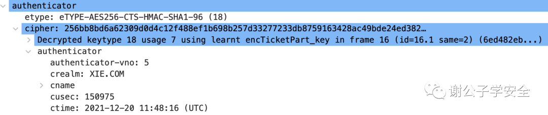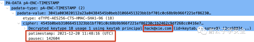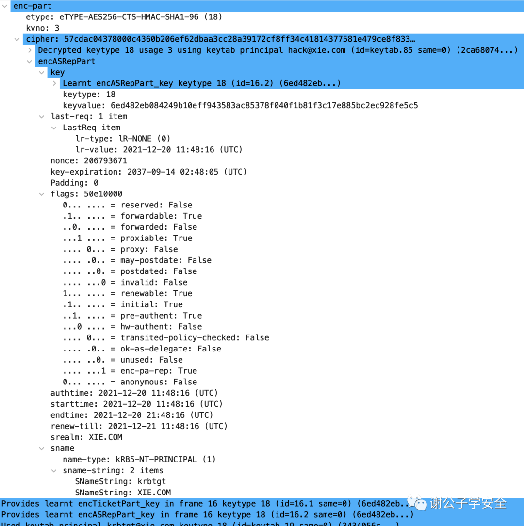 我们对最外层的enc-part部分进行解密,如图所示,可以看到是使用hack用户的密钥对其进行解密的。