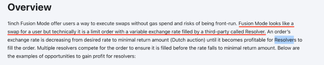 根据 1inch 官方文档对 Fusion 功能的介绍,Fusion 功能实现上是基于 1inch V5 聚合器合约。不同的是这次 1inch 在此基础上引入了新的概念,名为 resolver。我们首先来看看官方对 resolver 的定义: