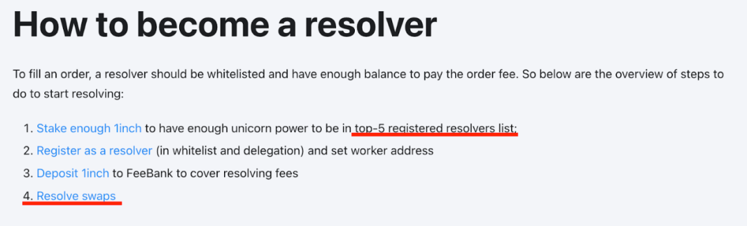 从描述上看,不难发现 resolver 是专门用于处理 Fusion Swap 订单的,也就是说针对 Fusion Swap 类型的订单,只有注册的 resolver 才可以处理。为此,1inch 也提供了一份关于如何成为 resolver 的流程: