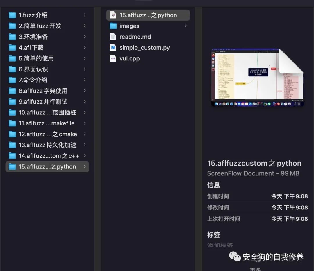 # AFLFuzz 漏挖掘基础* 1.fuzz介绍* 2.简单fuzz开发* 3.AFL介绍* 4.使用介绍* 5. 简单的使用* 6. UI界面认识* 7. 版本间的使用区别# 中级* 8.AFLFuzz 字典使用* 9.AFLFuzz 持续测试* 10.AFLFuzz 并行测试* 11.AFLFuzz 运行选项# 高级* 12..AFLFuzz 指定范围插桩* 13.AFLFuzz 自定义编译器* 14. AFLFuzz python定义变异器* 15. AFLFuzz C++ 定义变异器* 16. 持久化加速* 17.QBDI+AFLFuzz模糊测试Android so库* 18.分端Fuzz 测试,Server和client端* 19.Frida+AFLFuzz 执行黑盒测试* 20.AFLFuzz 实战* 21.扩展(待定)