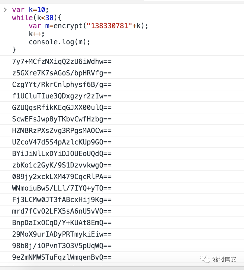 var k=10;while(k<30){var m=encrypt("138330781"+k);k++;console.log(m);}