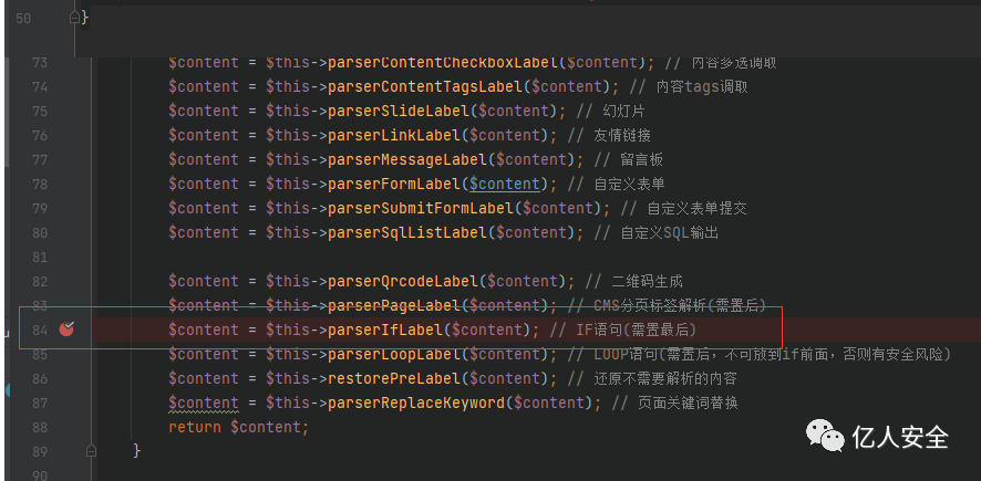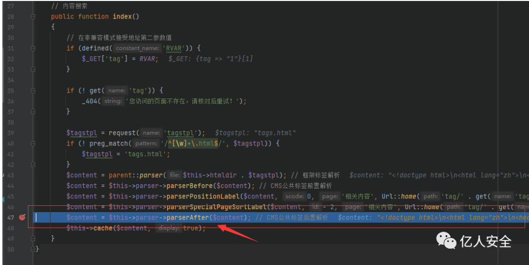 跟进到apps/home/controller/TagController.php的inde()方法,跟进第47行并跟进到apps/home/controller/ParserController.phpparserAfter()方法,最后就会到84行的漏洞方法中。