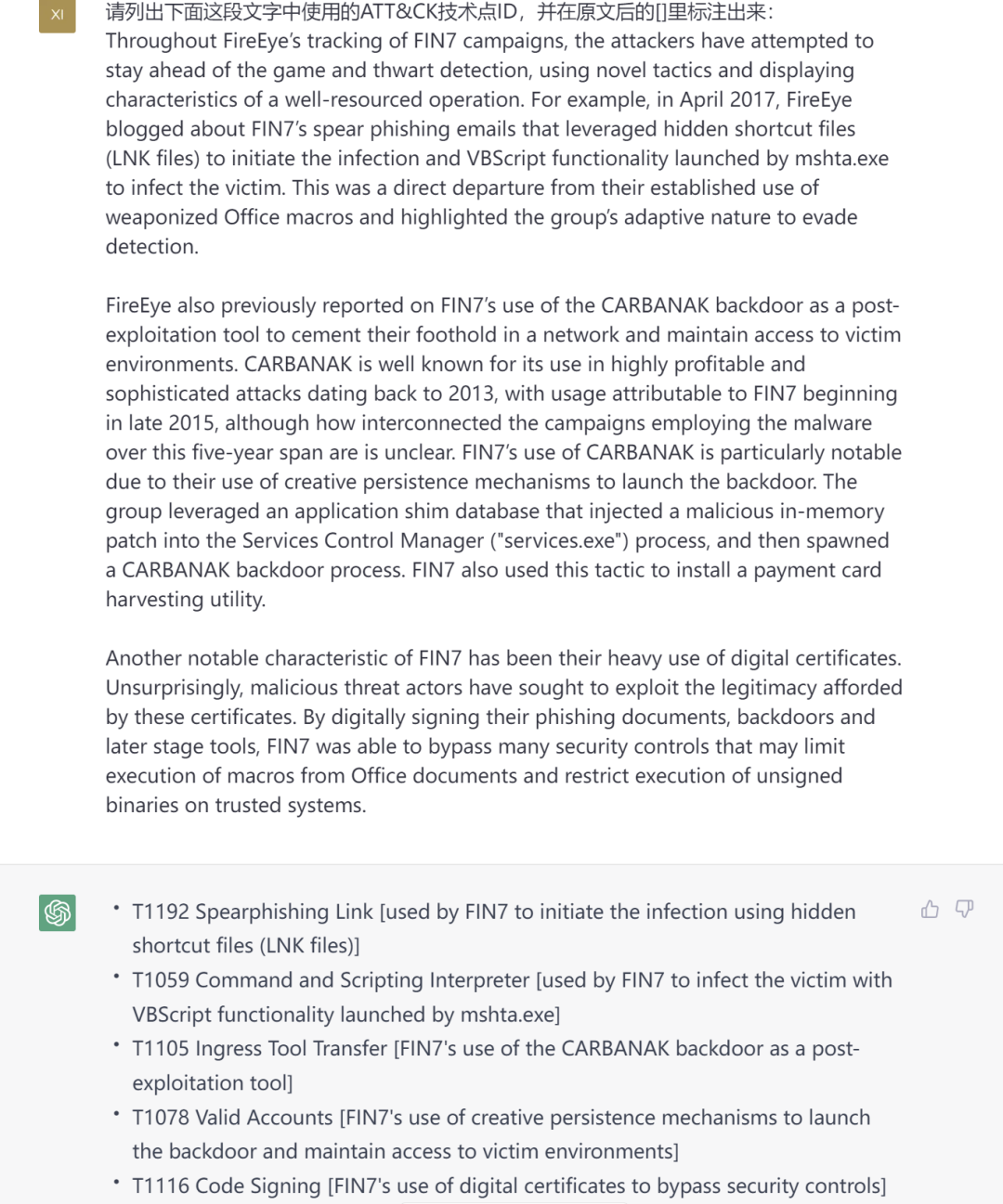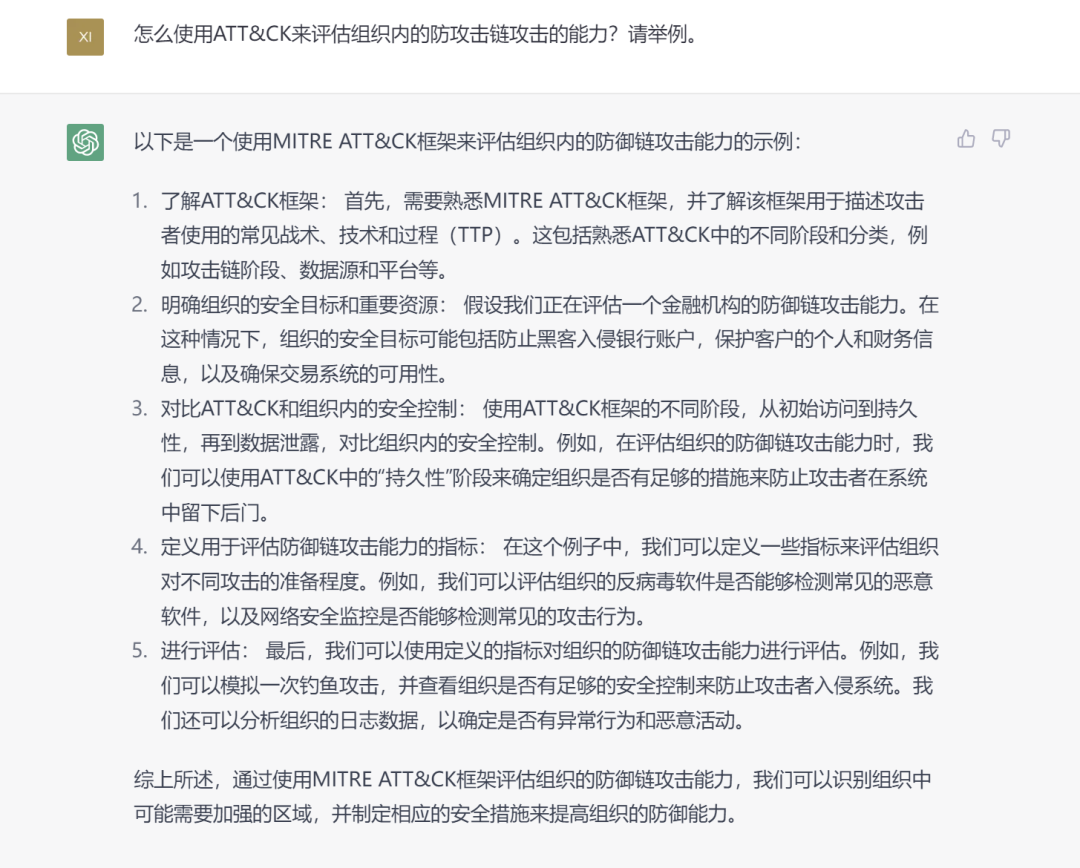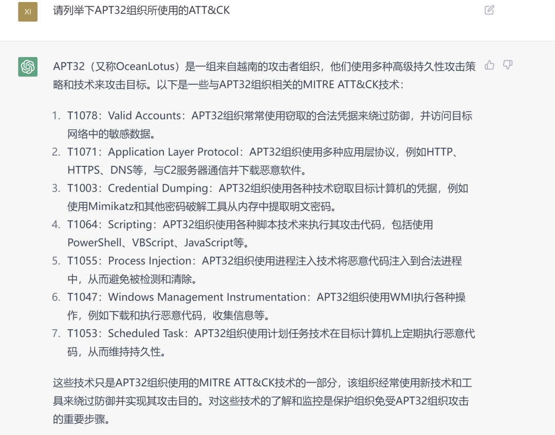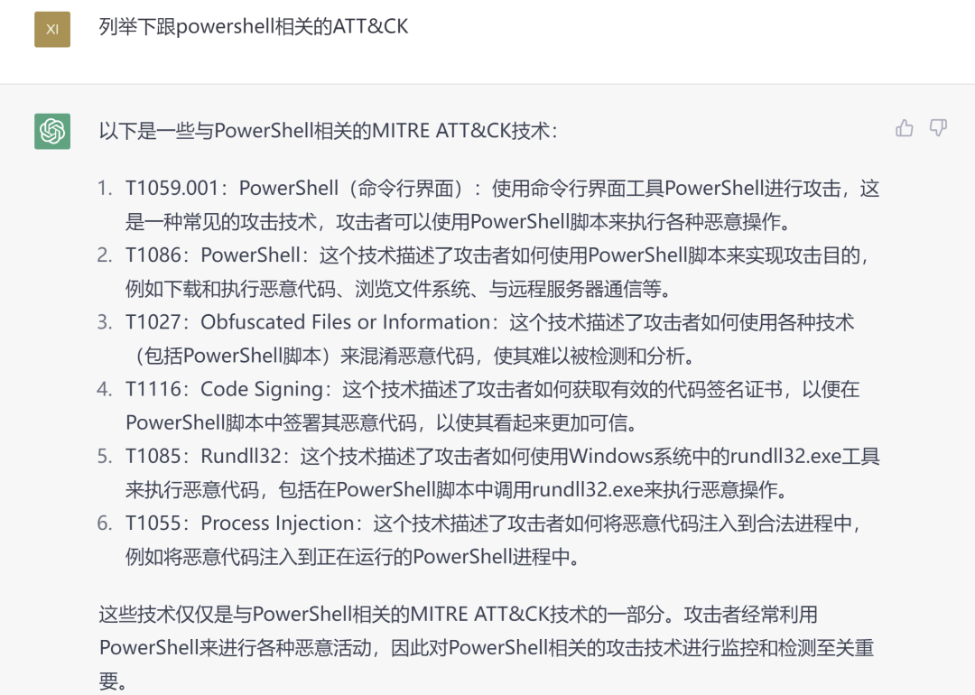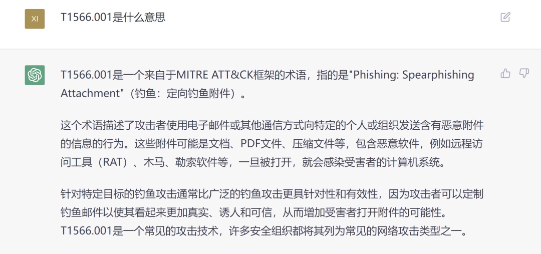 上面问题主要考察了ChatGPT对ATT&CK相关概念的理解程度,结果还是非常让人满意的。