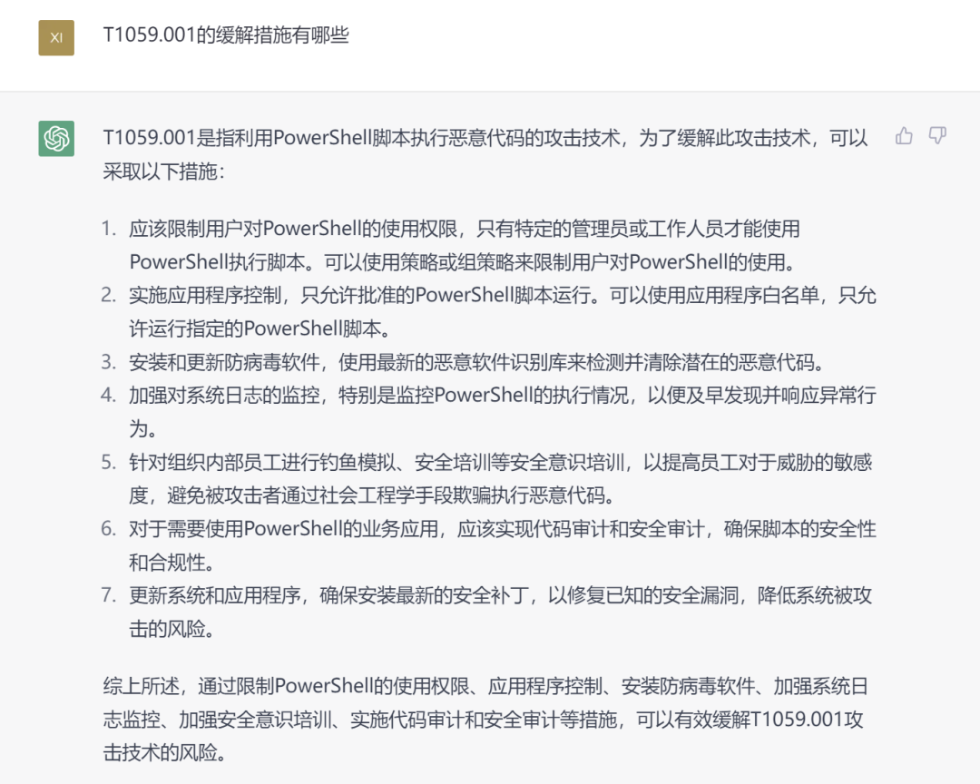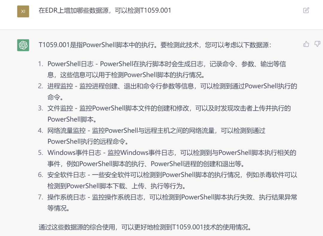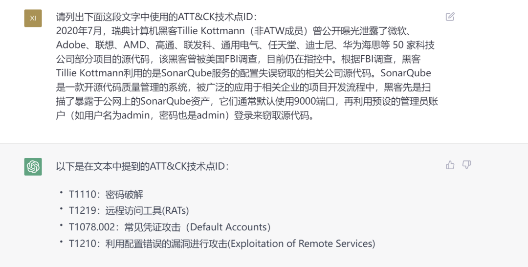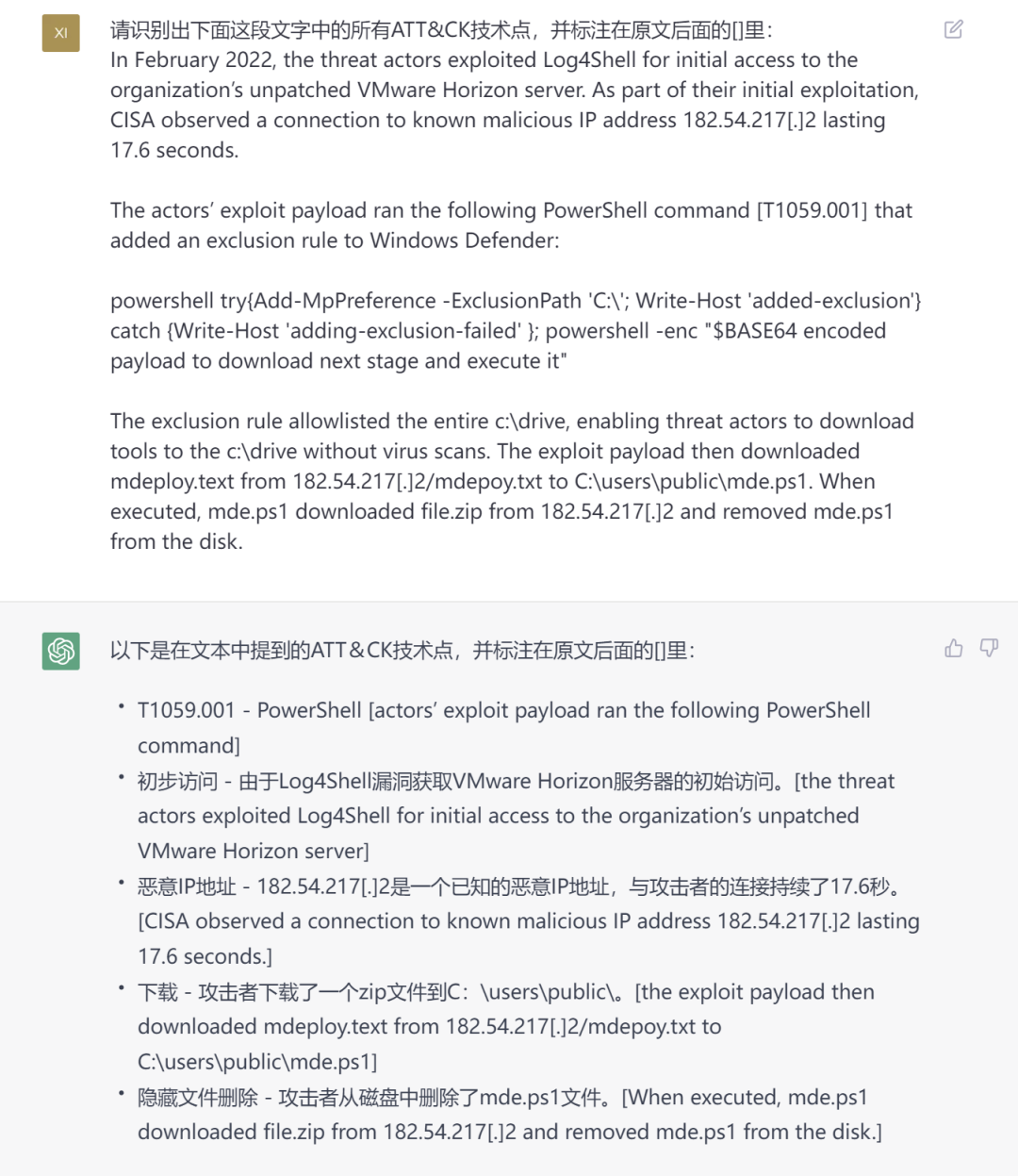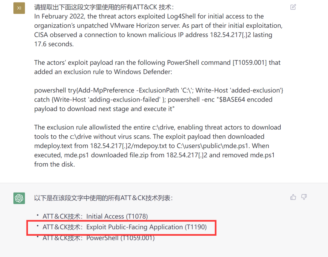 上面问题主要考察了ChatGPT对ATT&CK相关概念的理解程度,结果还是非常让人满意的。
