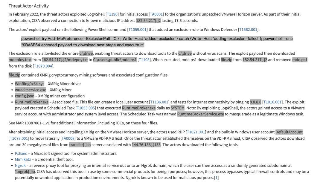 T1190:the threat actors exploited Log4Shell [T1190] for initial access [TA0001] to the organization’s unpatched VMware Horizon server.