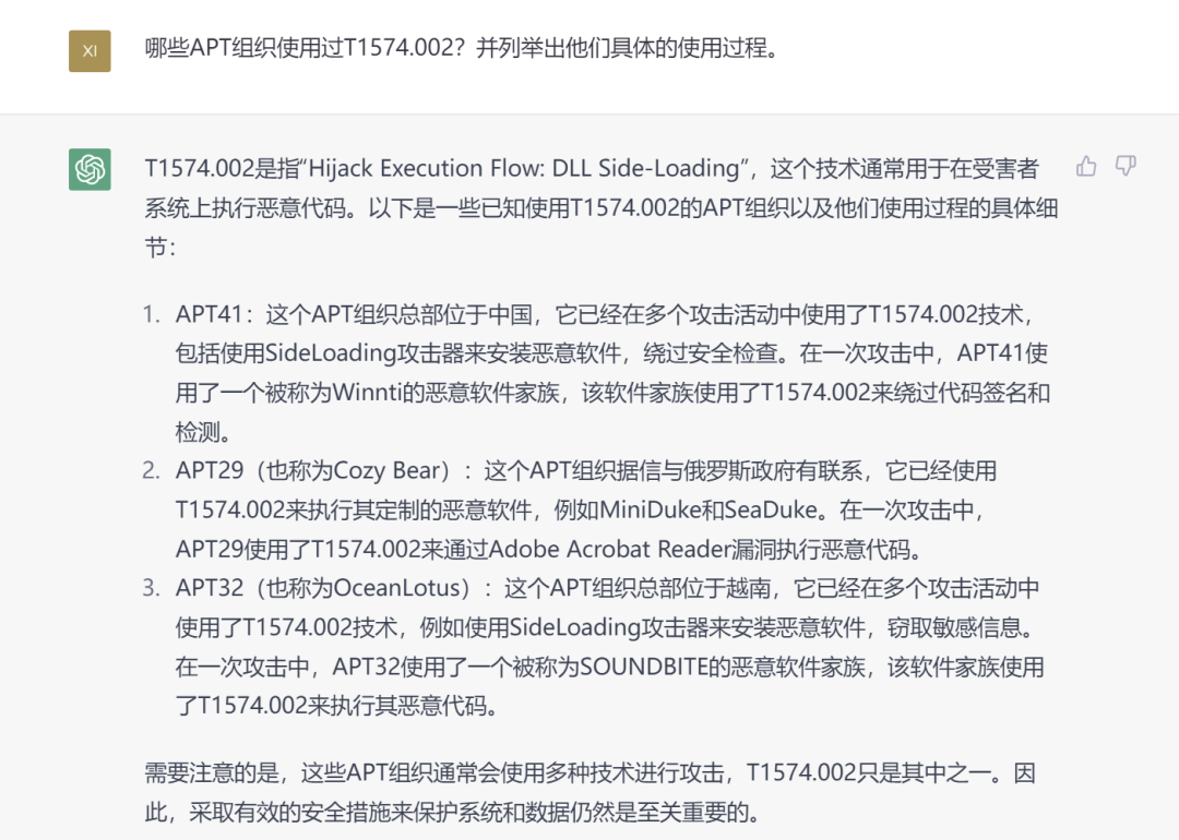 针对这个问题,ChatGPT并未给出相关的结论。不过正如笔者上面所说,根据ATT&CK ID来进行归因并不科学。而ChatGPT也给出了同样的建议: