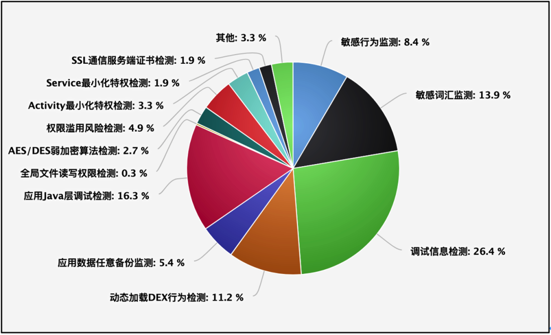 截止2023年02月底,潮启移动端安全管控平台共监测到山东省10余种类型中高危漏洞,其中敏感词汇监测、调试信息泄露、动态加载DEX行为检测、开启应用Java层调试等占比较高。