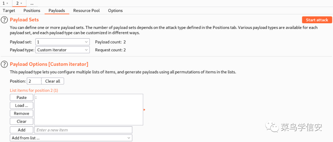 设置 Payload type 为 Custom iterator,在 Position 1 的位置添加用户名: