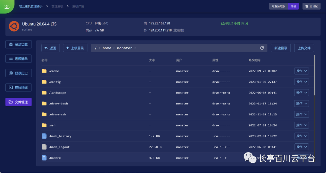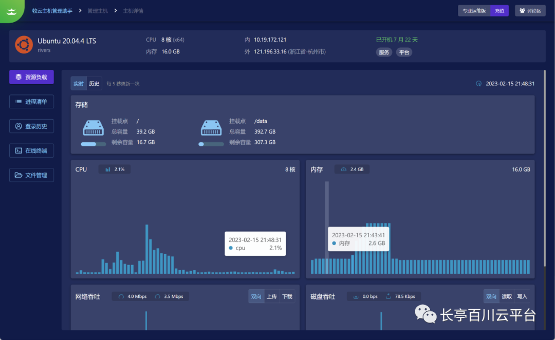 有别于其他相似的产品,牧云主机管理助手致力于让技术爱好者能方便、快捷、优雅的管理远程主机,而非傻瓜式管理,主要优势在于:1.1 资源监控