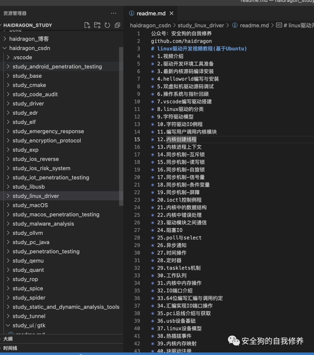 公众号:安全狗的自我修养github.com/haidragon# linux驱动开发视频教程(基于Ubuntu)* 1.视频介绍* 2.驱动开发环境工具准备* 3.最新内核源码编译安装* 4.helloworld编写与安装* 5.双虚拟机驱动源码调试* 6.操作系统与指针回顾* 7.vscode编写驱动搭建* 8.linux驱动的分类* 9.字符驱动模型* 10.字符驱动IO例程* 11.编写用户调用内核模块* 12.内核创建线程* 13.内核进程上下文* 14.同步机制-互斥锁* 15.同步机制-读写锁* 16.同步机制-自旋锁* 17.同步机制-信号量* 18.同步机制-条件变量* 19.同步机制-屏障* 20.ioctl控制例程* 21.内核中的数据结构* 22.内核中错误处理* 23.驱动模块之间通信* 24.阻塞IO* 25.poll与select* 26.异步通知* 27.时间操作* 28.定时器* 29.tasklets机制* 30.工作队列* 31.内核中内存操作* 32.IO端口介绍* 33.64位编写汇编与调用约定* 34.汇编实现IO端口操作* 35.pci总线介绍与获取* 36.usb设备基础* 37.linux设备模型* 38.热插拔事件* 39.内核内存映射* 40.块驱动注册* 41.网络驱动开发* 42.TTY驱动开发