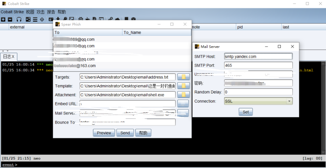 Cobaltstrike批量发送钓鱼邮件,需要导入邮件模板eml文件、提前准备好的免杀木马或钓鱼网站地址、配置好mail server,使用Yadex需要提前开启imap协议和app登录授权码,然后将STMP信息配置到mailserver中,就可以批量发送钓鱼邮件了。