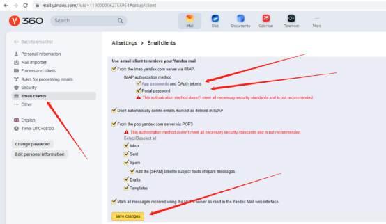 From the imap.yandex.com server via IMAP 和 App passwords and OAuth tokens 打开并保存。