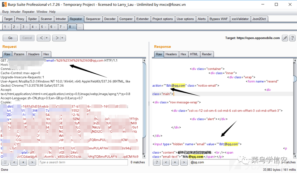 记得之前看过一篇文章,有些服务在发送完邮件后会弹出一个“邮件已发送+email”的页面导致反射型XSS,感觉就是这种了。随手测试了一下,发现直接waf了空格、双引号、尖括号,和"\"。实体了html编码的尖括号,但是没有实体html编码的双引号。![]()