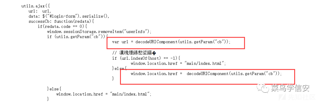 这里开发者还是对cb参数进行了意识形态的过滤,如果cb不包含host则强制重定向首页。但是略鸡肋,直接把host放在注释符后就能绕过。![]()