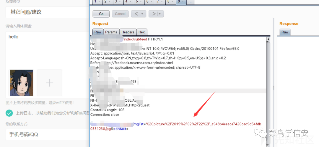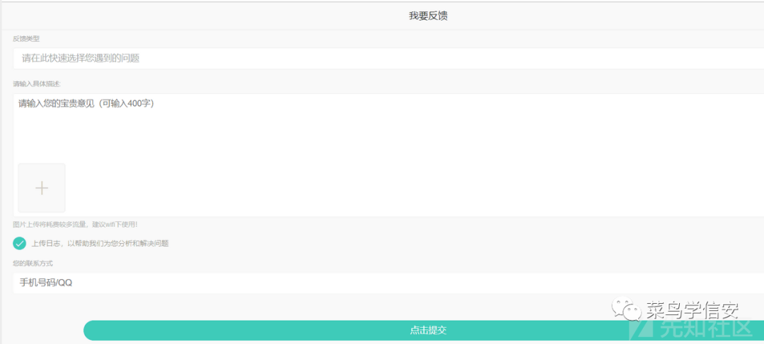 上传图片->提交反馈->服务端拼接提交的img参数(uri)为img标签src属性的完整地址测试上传一个图片后,点击提交反馈并抓包,imglist参数是刚才上传图片返回的uri地址。![]()