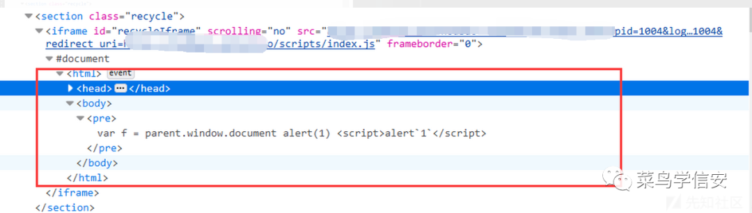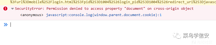 虽然是在SRC业务站点弹的框,但真正的域应该是子页面的。打印一下COOKIE验证,果然是子页面域的cookie。由于waf掉了document.cookie和javascript:alert,我用了html编码的':'和八进制js编码的'.'绕过,完整打印子页面域payload如下https://src.com?url=redirect_uri%3Djavascript%26%23x3A%3Bconsole.log(document\56cookie)