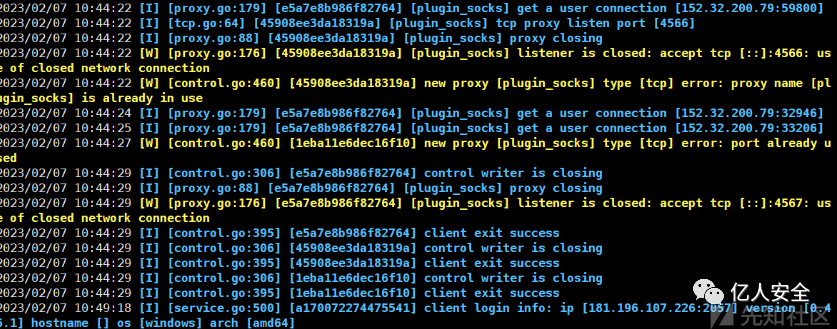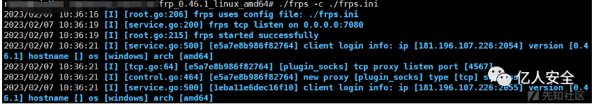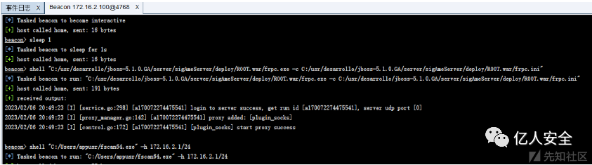 shell "C:/usr/desarrollo/jboss-5.1.0.GA/server/sigAmeServer/deploy/ROOT.war/frpc.exe -c C:/usr/desarrollo/jboss-5.1.0.GA/server/sigAmeServer/deploy/ROOT.war/frpc.ini"7、在服务器上可以看到,已经有连接返回了